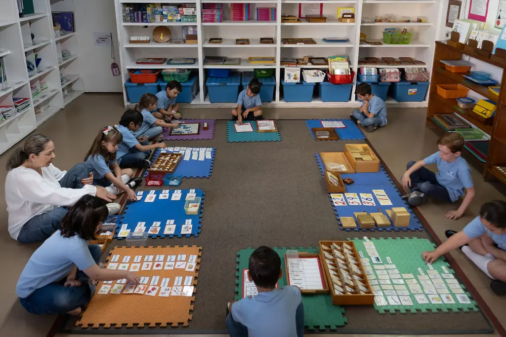 El profesor está activo en la clase y se mueve en el aula para acompañar el trabajo de cada niño y de todos. En ese momento, da presentaciones individuales y a grupos pequeños de niños, mientras los demás siguen enfocados en su trabajo. El ambiente es armonioso, pues cada uno está concentrado en hacer lo que planeó, a la vez que está con todos en su grupo y observando lo que sucede alrededor.